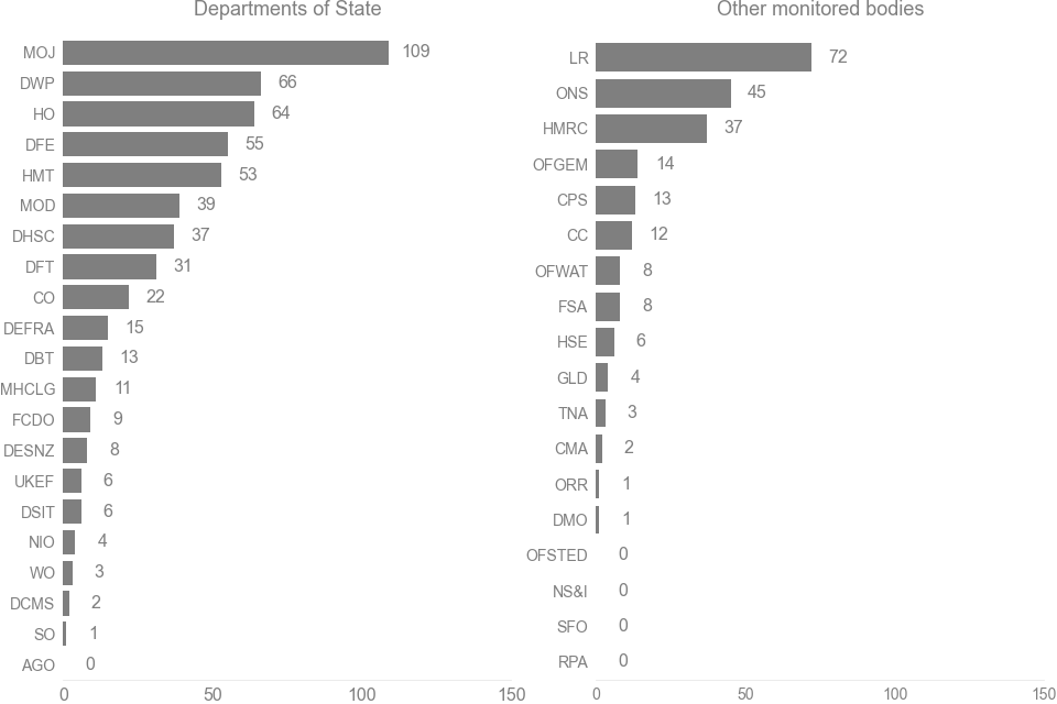 The Home Office, the Ministry of Defence, the Ministry of Justice, and the Department for Work and Pensions accounted for just over half (50.1%) of requests to Departments of State; whilst The National Archives alone accounted for nearly three-quarters (73%) of requests to other monitored bodies.