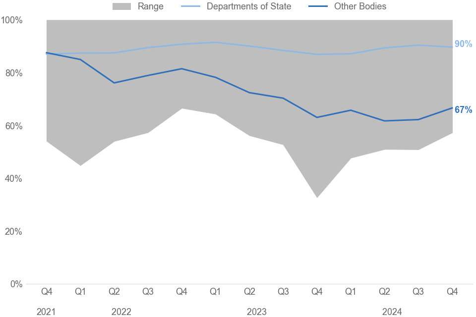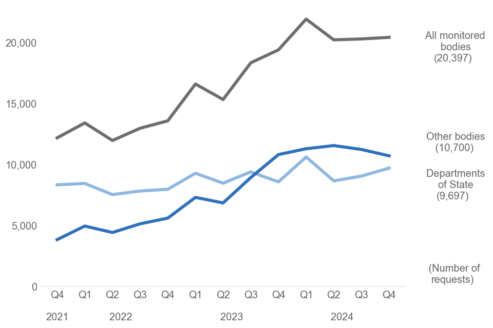 Fewer than half (9,697) of requests were at Departments of State, with the majority (10,700) being received by other monitored bodies. The number of requests at Departments of State is 868 higher compared to the same quarter in 2023, while the number of requests for other monitored bodies is 103 lower for Q4 compared to the same quarter in 2023.