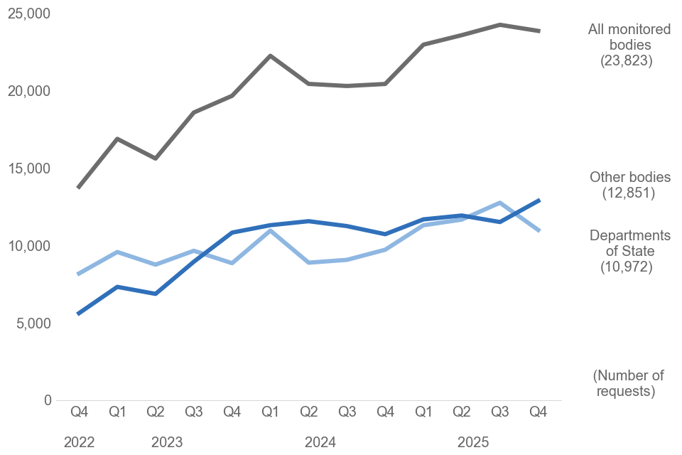 Fewer than half (10,972) of requests were to Departments of State, with the majority (12,851) being received by other monitored bodies. The number of requests to Departments of State is 1,275 higher compared to the same quarter in 2024, while the number of requests to other monitored bodies is 2,151 higher compared to Q4 in 2024.