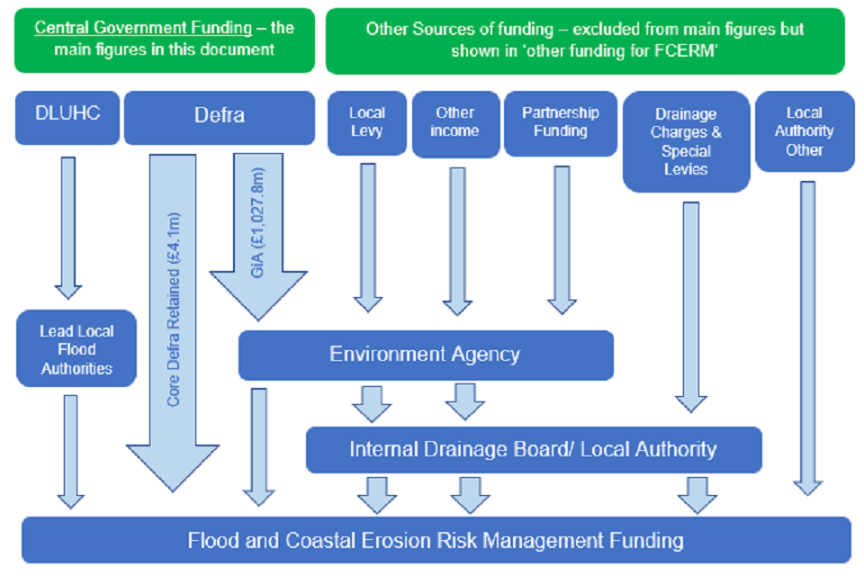 Funding for FCERM is administered through Defra, the EA and the Department for Levelling Up, Housing and Communities (DLUHC) (formerly Ministry of Housing, Communities and Local Government - MHCLG). Other sources of funding are excluded from the main figures because they are raised locally, but some details can be found in the section ‘Other funding for flood and coastal erosion risk management’.