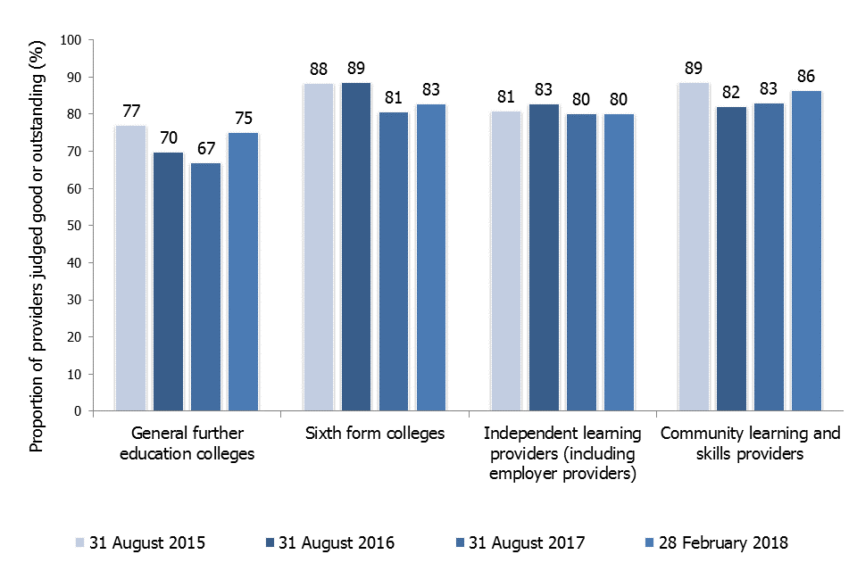 The proportion of general further education colleges, sixth-form colleges and community learning and skills providers judged good or outstanding has increased since 31 August 2017, as shown in Figure 1.