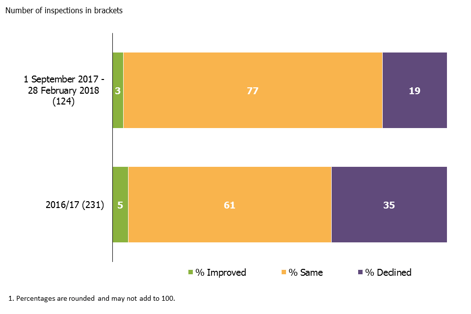 At the mid-year point, the same number of short inspections had been carried out as there were for the whole of the last reporting year (12), with the outcomes being very similar across both years. However, as the short inspections made up a higher proportion of all inspections conducted between 1 September 2017 and 28 February 2018, they had a greater influence on the proportion judged good overall.