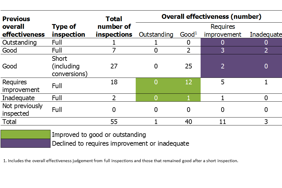 - 2 risk-assessed full inspections of academies previously judged good, both of which declined to requires improvement