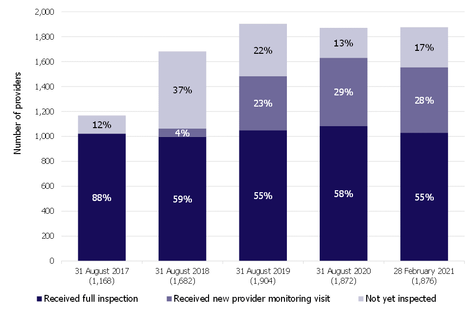 The proportion of providers not yet inspected or visited as at 28 February 2021 was 17%. This is an increase of 4 percentage points since 31 August 2020 (see Figure 1).