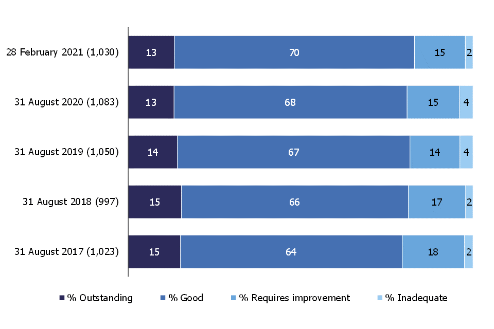 The proportion of providers judged good or outstanding as at 28 February 2021 was 83%, an increase of 2 percentage points since 31 August 2020.