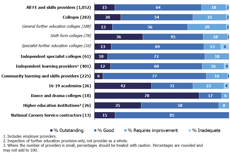 The proportion of sixth form colleges judged good or outstanding was 63%, 7 percentage points lower than last year.