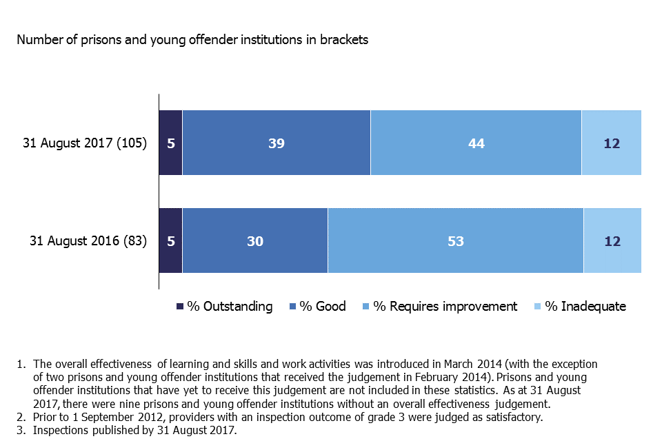 Ofsted contributed to 41 prison and YOI inspections, where the reports were published between 1 September 2016 and 31 August 2017. Of these, 56% were judged good or outstanding for the overall effectiveness of learning and skills and work activities (overall effectiveness). This is 16 percentage points higher than last year.