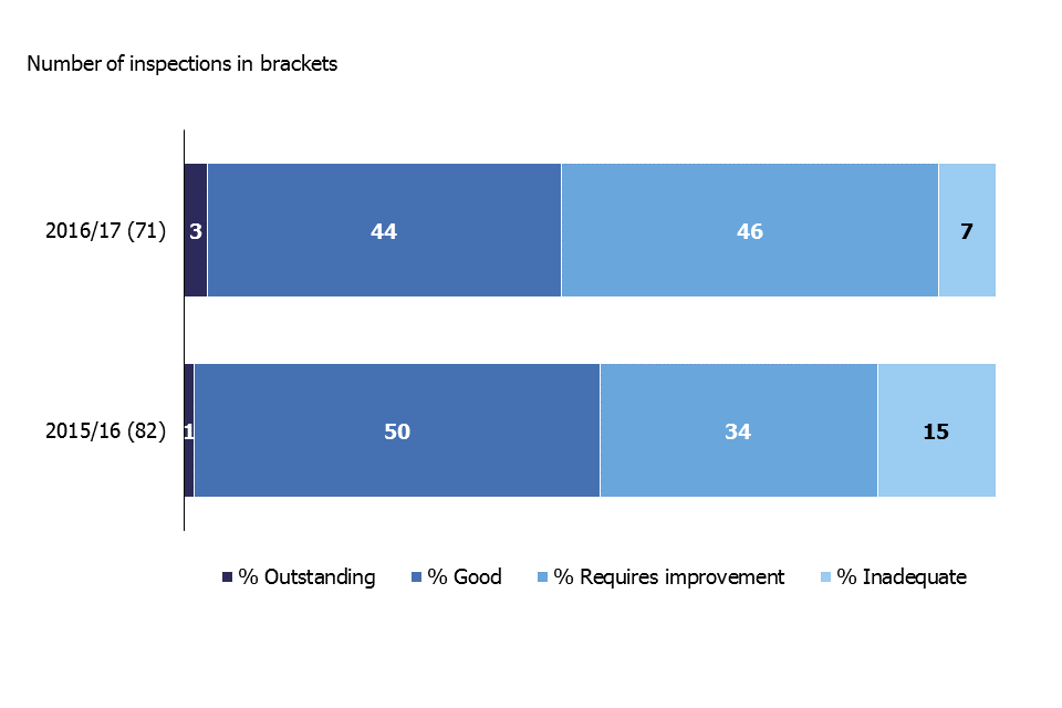The proportion of sixth form colleges judged good or outstanding at their most recent inspection was 8 percentage points lower as at 31 August 2017 than as at 31 August 2016