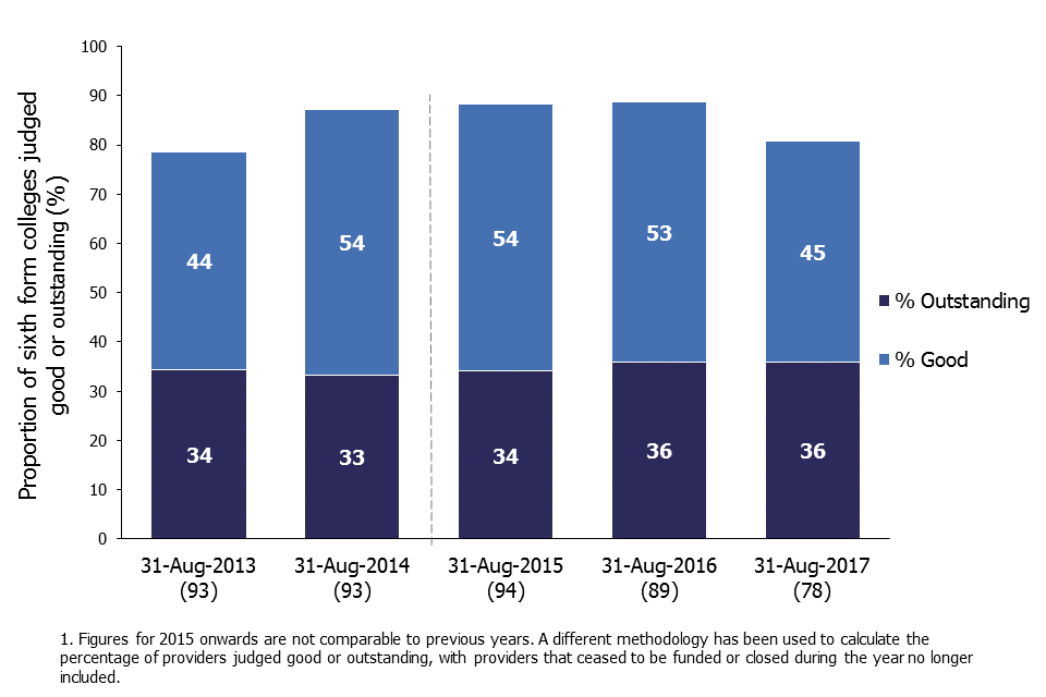 This reduction had a negative effect on the proportion of sixth form colleges judged good or outstanding at their most recent inspection, which declined for the first time in 3 years. The proportion of sixth form colleges judged good or outstanding declined by 8 percentage points, from 89% as at 31 August 2016 to 81% as at 31 August 2017.