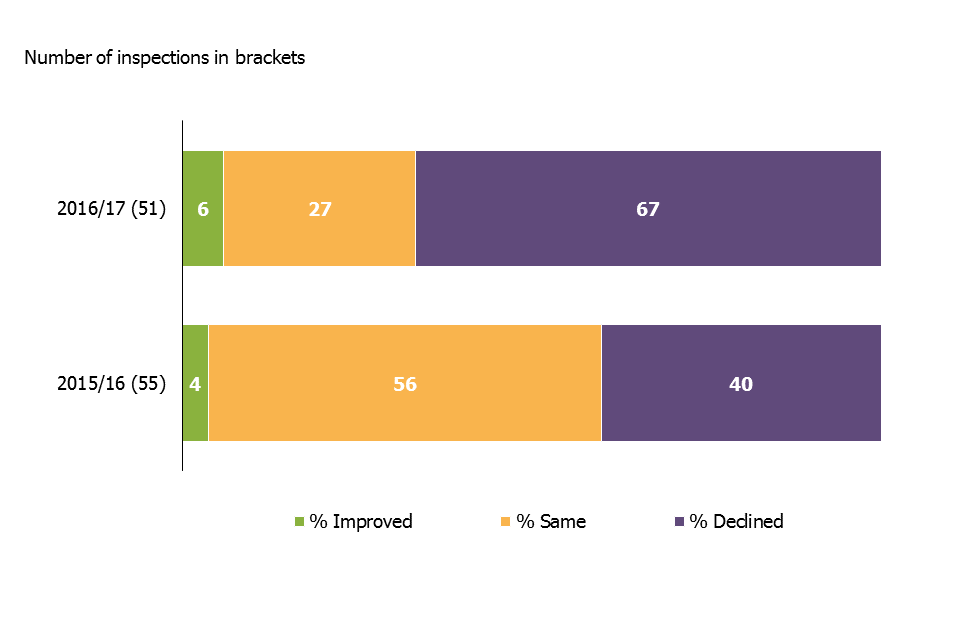 Between 1 September 2016 and 31 August 2017, more providers declined to requires improvement or inadequate (43) than improved to good or outstanding (26).