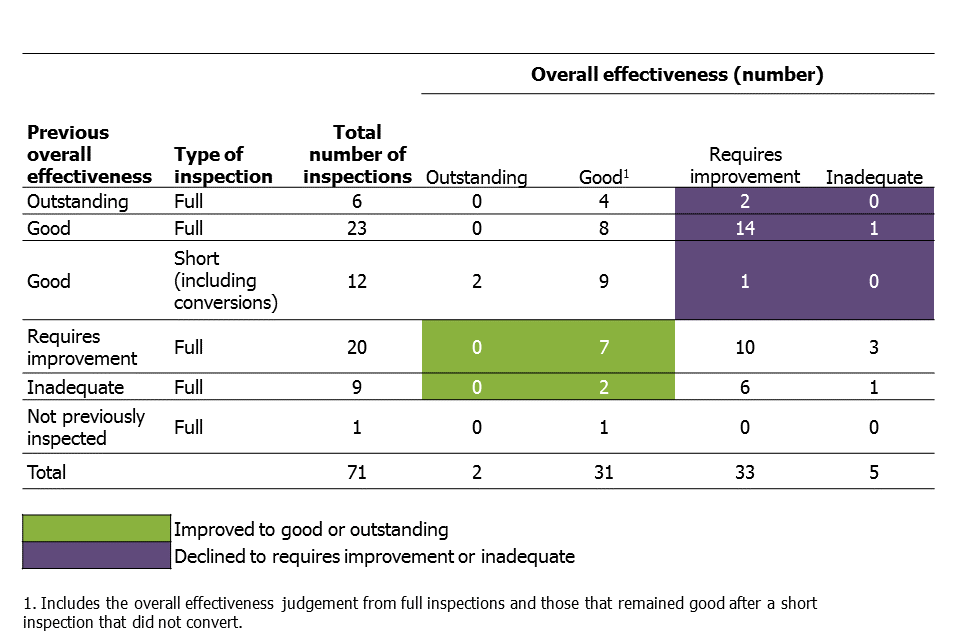 However, it should be noted that sixth form colleges had a smaller number of colleges decline from good or outstanding compared with other larger provider groups. As sixth form colleges are a smaller group of providers, the number declining has a bigger effect on the most recent inspection outcomes.