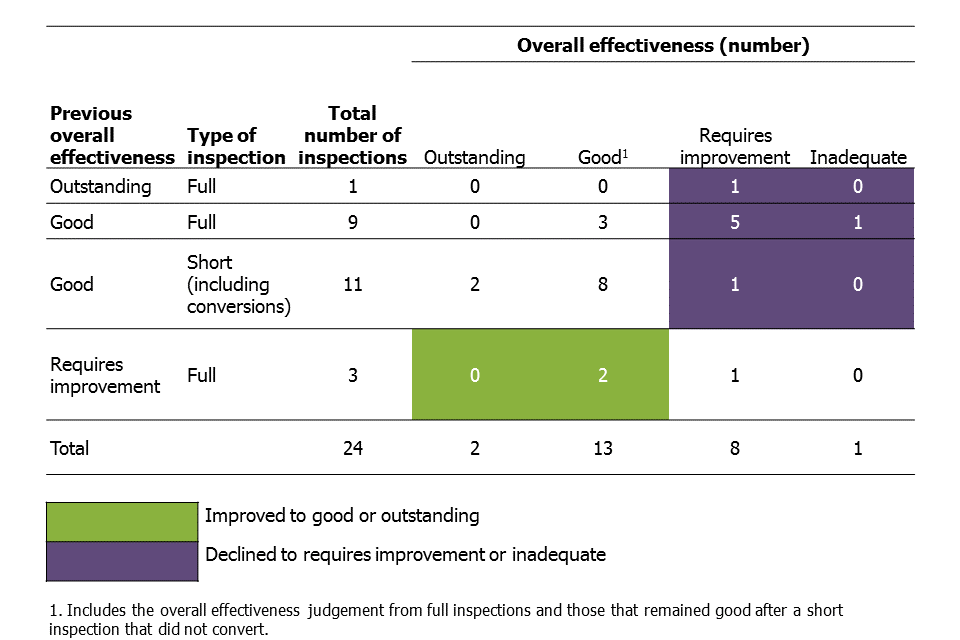 During this reporting year, more sixth form colleges declined to requires improvement or inadequate (8), than improved to good or outstanding (2).