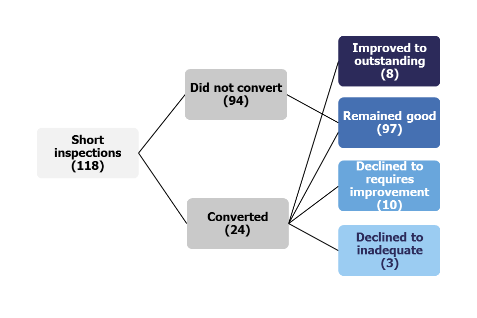 Of the 118 short inspections, 94 providers remained good and 24 short inspections converted to a full inspection. From these converted inspections 8 providers improved to outstanding, 3 remained good, 10 declined to requires improvement and 3 declined to inadequate.