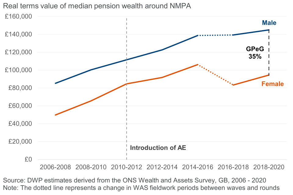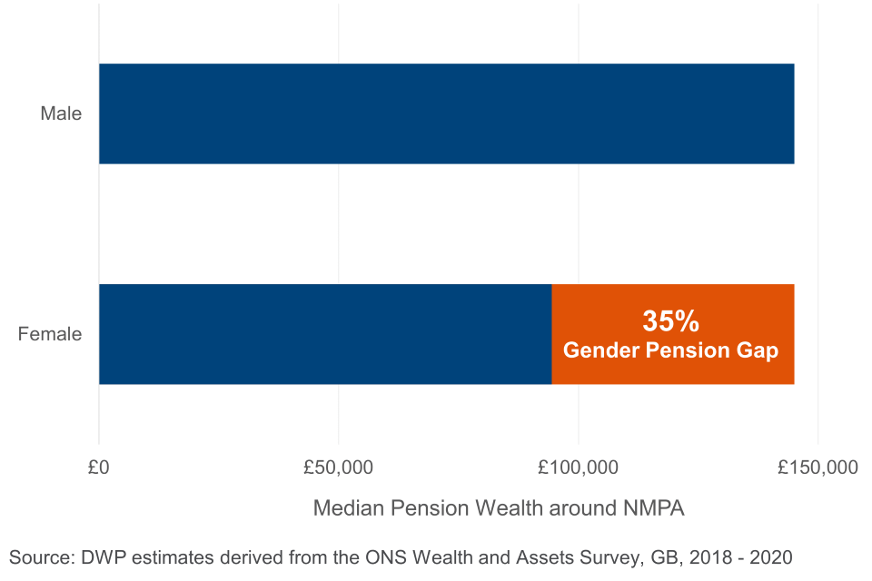 A 35% gap between uncrystallised non-zero median private pension wealth between men and women around NMPA.