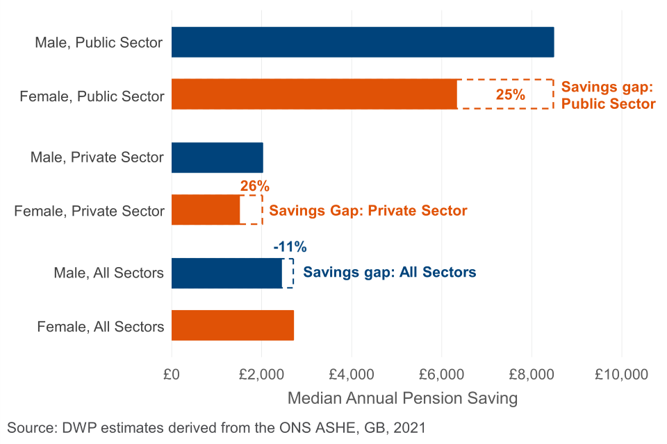 Figure 6: The median female eligible employee saves less into a workplace pension than the equivalent male in both the private and public sector (2021)