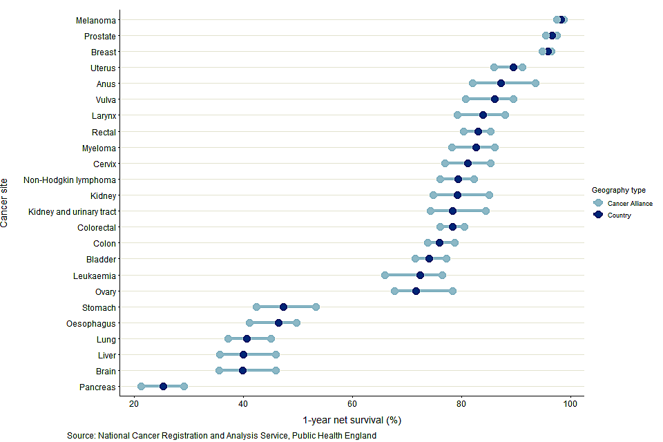 Across the 24 cancer sites, the Alliance with the largest difference in 1-year survival estimates was Lancashire and South Cumbria CA, a difference of 76.6 percentage points from 21.3% for pancreas cancer to 97.9% for melanoma.