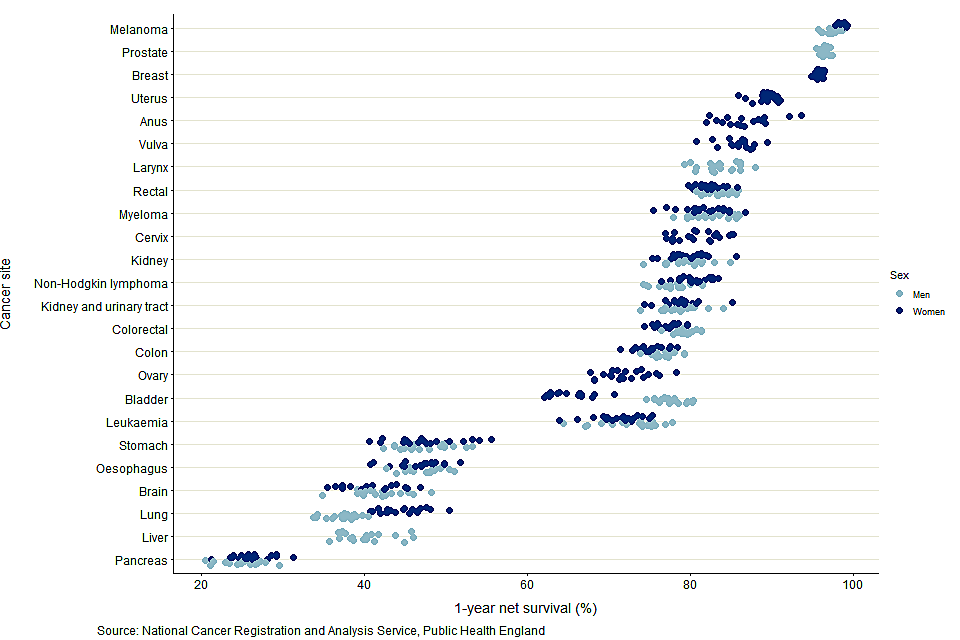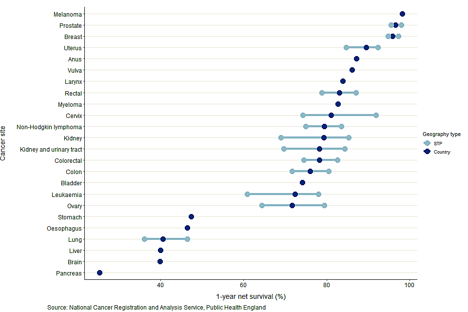 - Cancer sites are included if there are enough age-standardised estimates available for STPs. A combination of site and sex is presented for all geographies if age-standardised 1-year survival estimates can be produced for at least 75% of STPs.