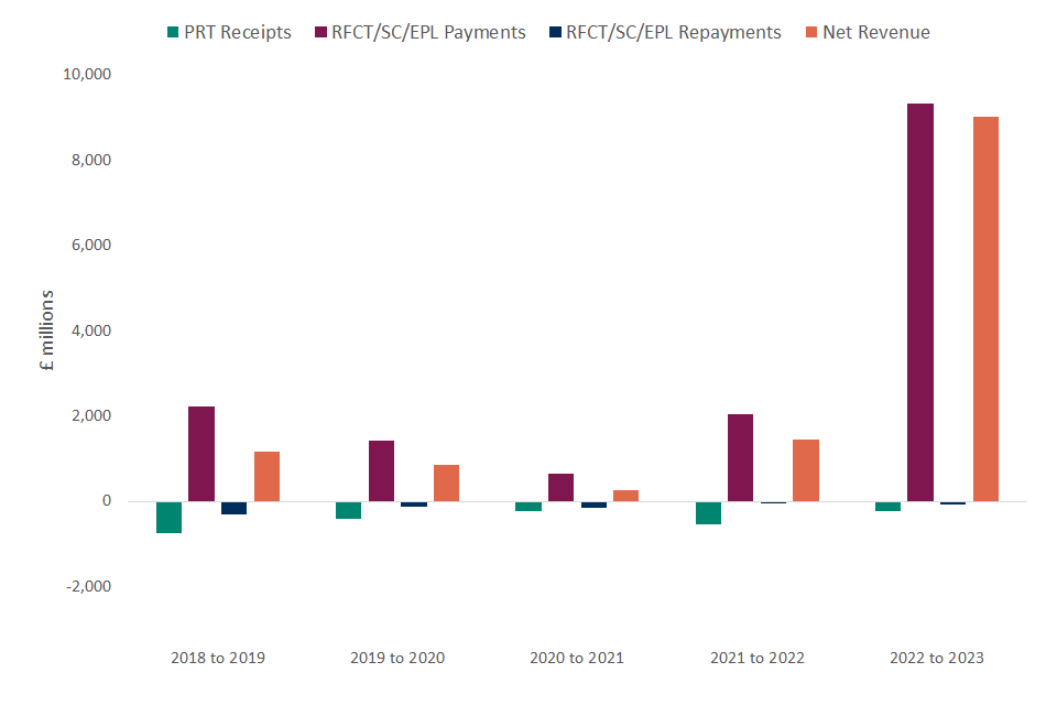 PRT repayments were £0.2 billion in financial year 2022 to 2023, a decrease of £0.3 billion compared with 2021 to 2022. Loss-making fields can carry their losses back to relieve profits and tax paid in previous years, subject to time limits and strict ordering.