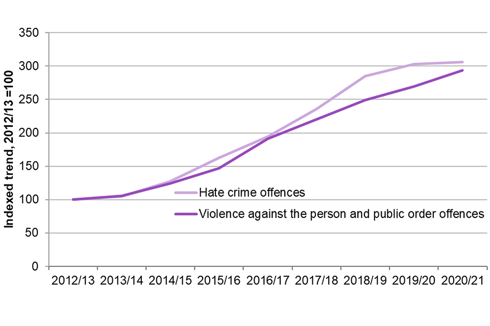 This statistical bulletin provides information on the number of hate crimes recorded by the police in England and Wales in year ending March 2021. Data for Greater Manchester Police have been excluded from any year-on-year comparisons within this bulletin as they were unable to supply data for year ending March 2020 following the implementation of a new IT system in July 2019.