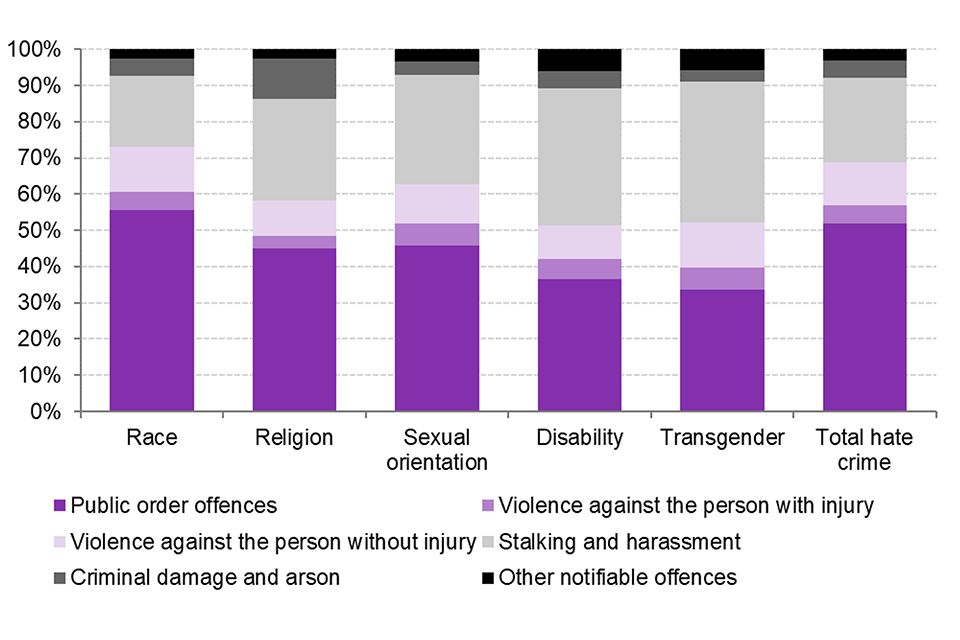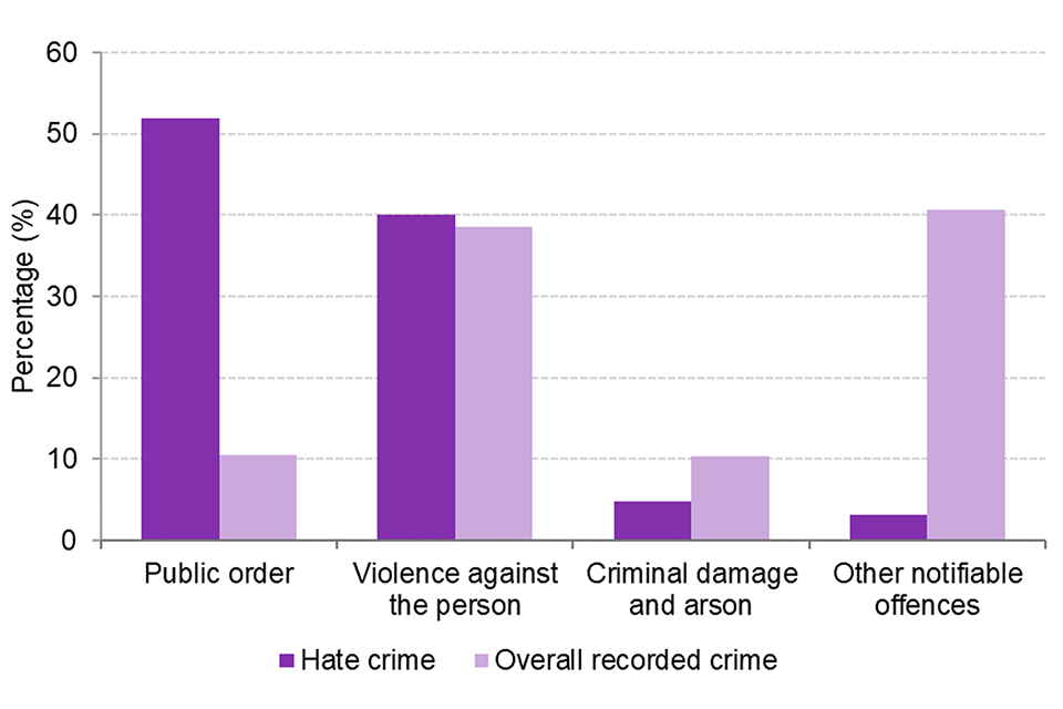 - over half (52%) of the hate crimes recorded by the police were for public order offences and a 40% were for violence against the person offences; five per cent were recorded as criminal damage and arson offences