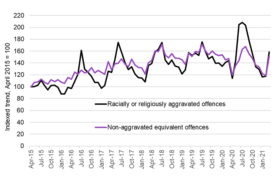 Figure 2.2: Indexed number of racially or religiously aggravated offences recorded by the police by month, April 2015 to March 2021