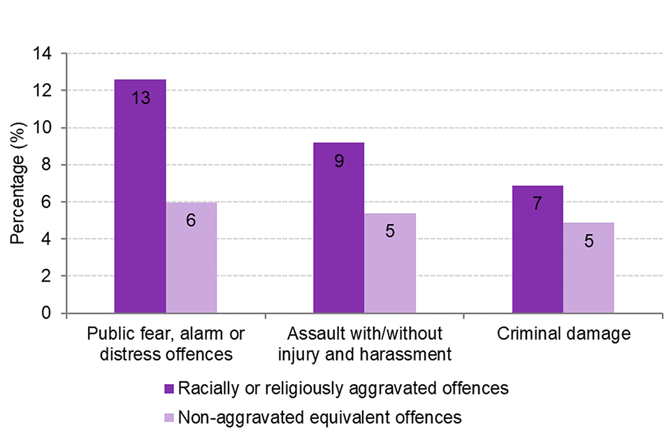 Figure 2.6: Percentage of racially or religiously aggravated offences and their non-aggravated equivalents recorded in year ending March 2021 resulting in charge or summons, by offence type