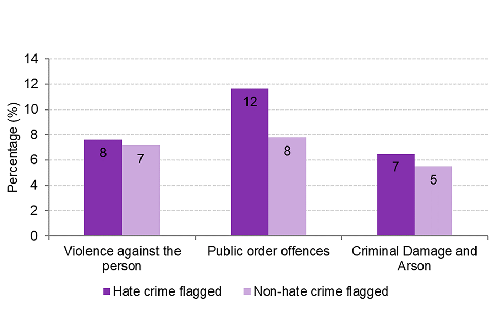 - eight per cent of violence against the person hate crime flagged offences, and seven per cent of criminal damage and arson hate crime flagged offences, were dealt with by a charge or summons, similar proportions to non-flagged offences (7% and 5% respectively)