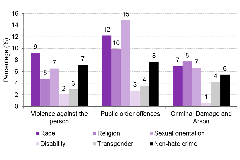 - a greater proportion (12%) of hate crime flagged public order offences had been dealt with by a charge or summons compared with non-hate crime flagged public order offences (8%)