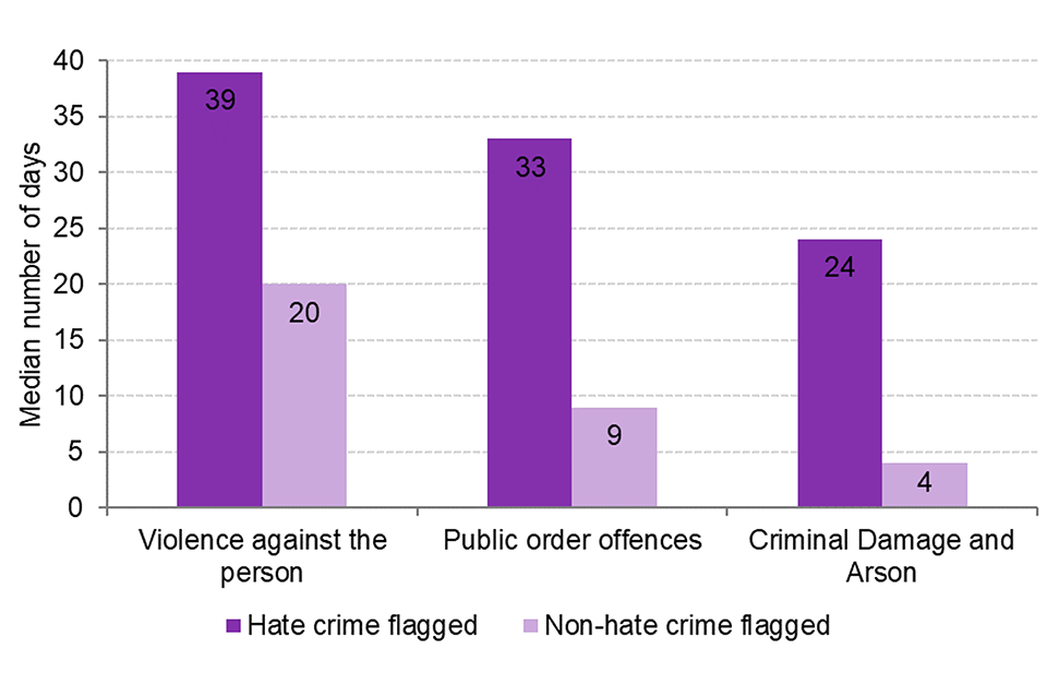 Figure 2.9 shows the median number of days taken to assign an outcome, from the date the crime was recorded, for selected hate crime and non-hate crime offences. Hate crime offences, on average, took longer to be assigned a final outcome than non-hate crime offences. For example, the median number of days taken to assign an outcome to criminal damage and arson hate crime offences was 24 days, compared with four days for non-hate crime offences. Similarly, it took longer to assign an outcome to violence against the person hate crime offences (median=39 days) than to non-hate crime flagged violent offences (median=20 days). This pattern is seen across the majority of outcomes, including charge or summons, evidential difficulty outcomes and investigation complete – no suspect identified. For example, it took on average 101 days to assign a charge for a violence against the person hate crime offence compared with 46 days for a violent offence that was not hate crime-related. This suggests more investigative effort being devoted to hate crime offences which reflects the serious nature of these crimes.