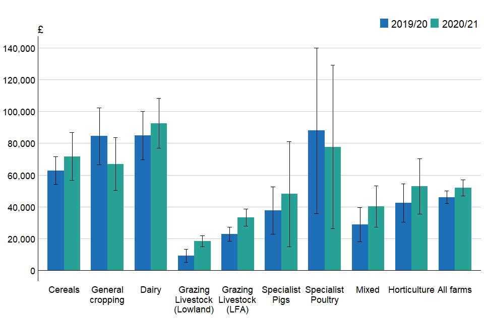 - In 2020/21, average Farm Business Income increased across all farm types except general cropping and specialist poultry. It was a far from typical year, the Covid-19 pandemic, challenging weather conditions (the extremely wet winter of 2020 and very dry spring of 2020) and the end of the EU exit transition period were just some of the influencing factors.