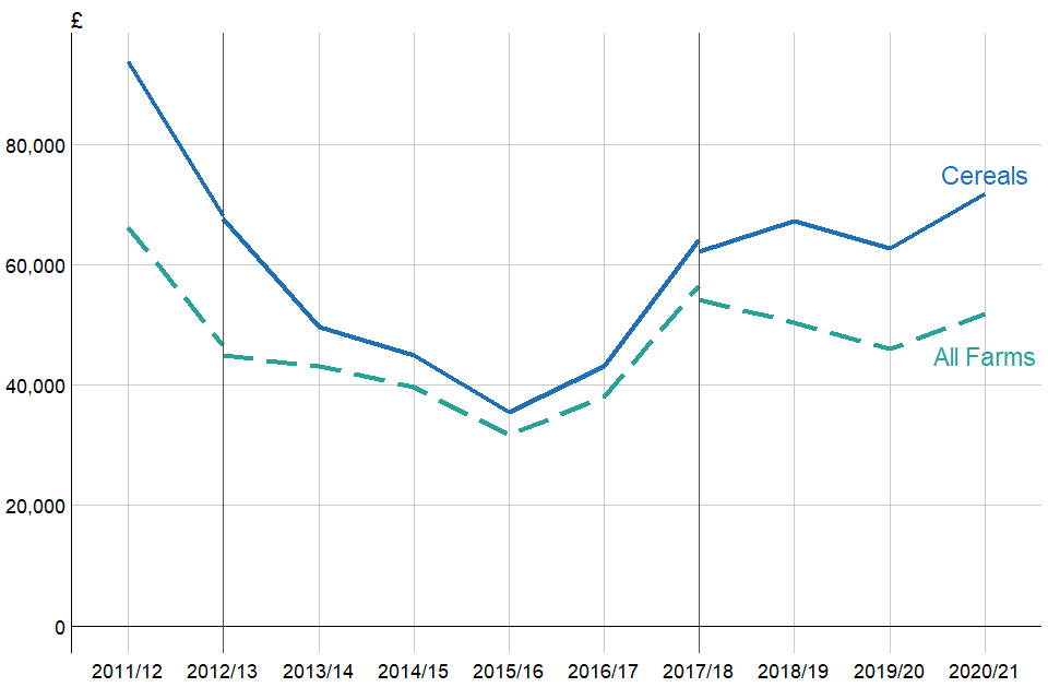 Average Farm Business Income (£ per farm) for cereal farms, England 2011/12 to 2020/21