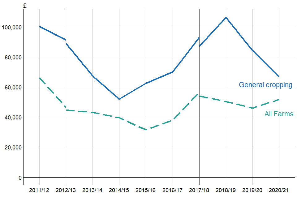 Average Farm Business Income (£ per farm) for General Cropping farms, England 2011/12 to 2020/21