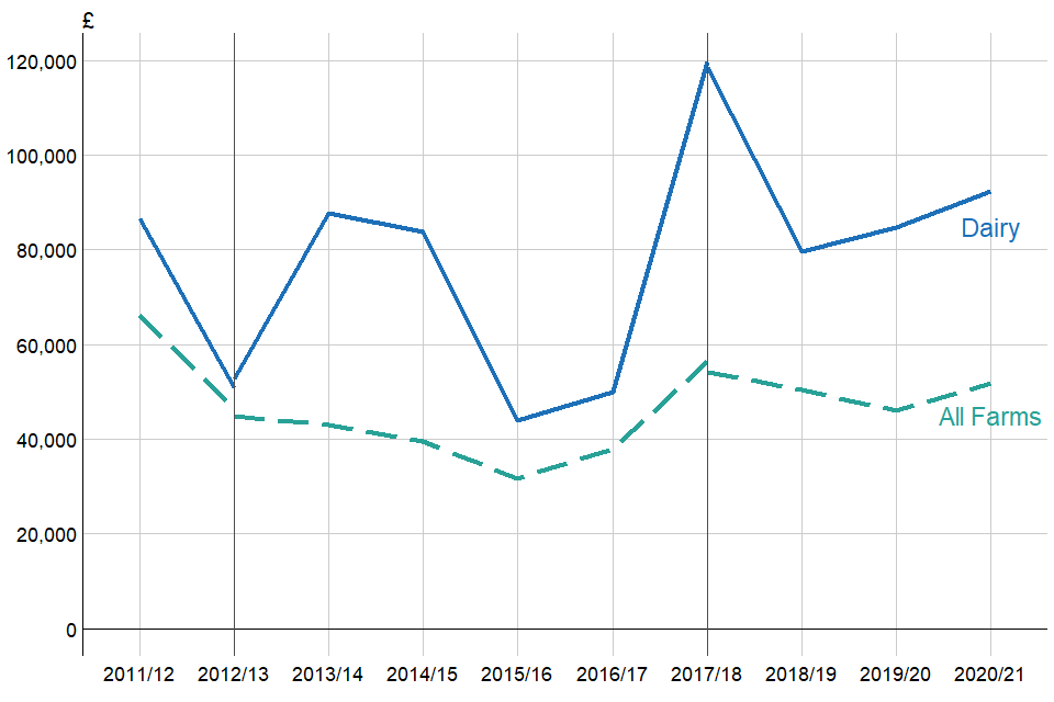 Average Farm Business Income (£ per farm) for Dairy farms, England 2011/12 to 2020/21