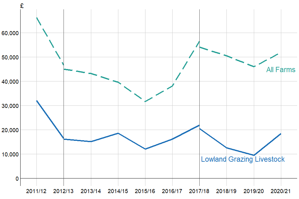 Average Farm Business Income (£ per farm) for Lowland Grazing Livestock farms, England 2011/12 to 2020/21