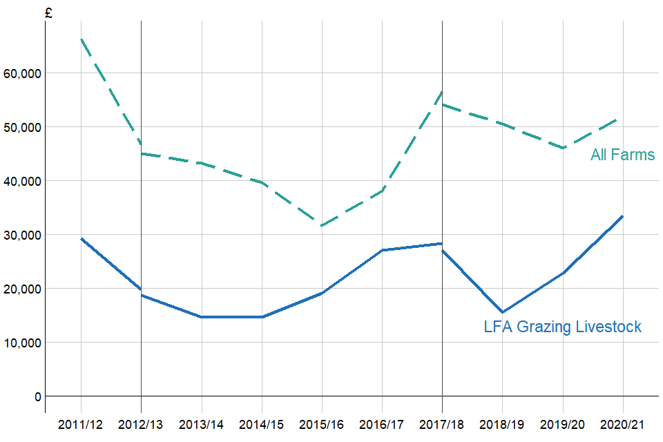 Average Farm Business Income (£ per farm) for LFA Grazing Livestock farms, England 2011/12 to 2020/21