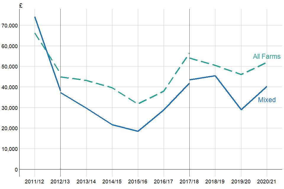 Average Farm Business Income (£ per farm) for Mixed farms, England 2011/12 to 2020/21