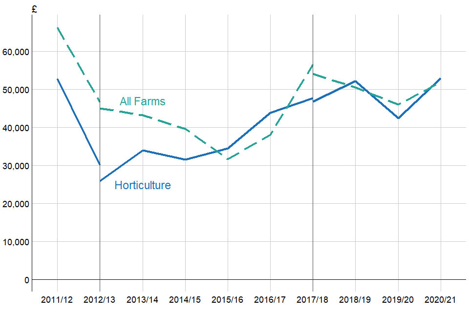 Average Farm Business Income (£ per farm) for Horticulture farms, England 2011/12 to 2020/21