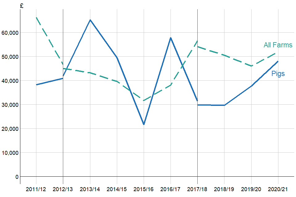 Average Farm Business Income (£ per farm) for Pig farms, England 2011/12 to 2020/21