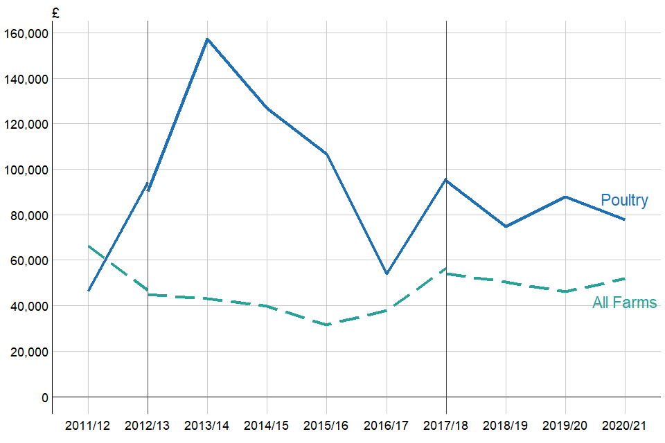 Average Farm Business Income (£ per farm) for Poultry farms, England 2011/12 to 2020/21