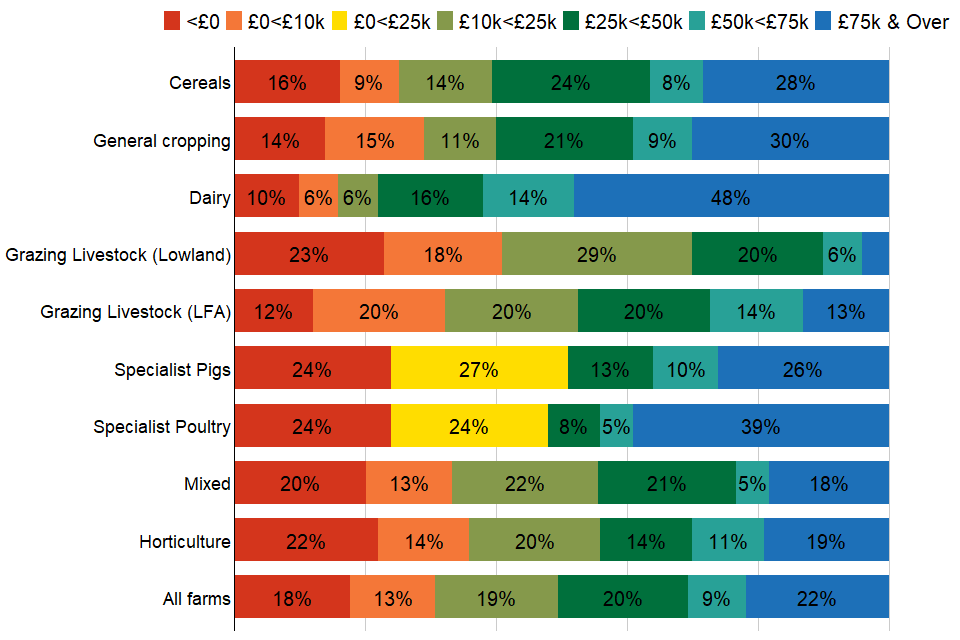 (a) The sample sizes for specialist pig and specialist poultry farms are relatively small with average incomes subject to greater variation. Also, due to the sample size, the £0>£10k and £10<£25k size groups have been merged for pig farms and poultry farms