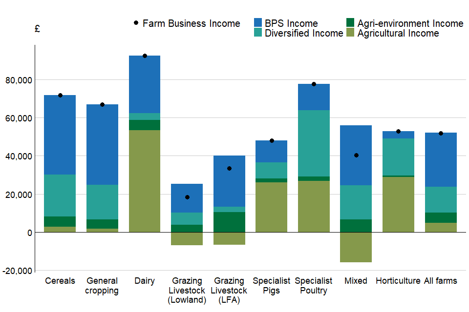 Farm Business Income can be broken down by cost centre (Figure 3.1) to illustrate the relative contribution to average total Farm Business Income (shown as text at the top of each column). Further information about the methodology adopted for allocating costs across cost centres can be found in Appendix 3 of [Farm Accounts in England](https://(www.gov.uk/government/statistics/farm-accounts-in-england).