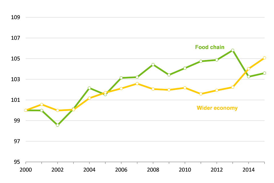 - Benchmarking against a wider economy measure shows that the average annual growth in the food chain in the ten years to 2015 was 0.2 per cent compared to 0.3 per cent in the wider economy.