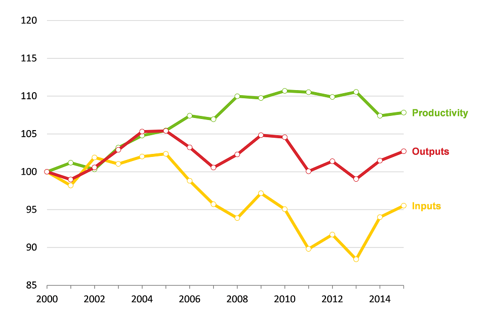 - Both inputs and outputs have increased between 2014 and 2015, but inputs have gone up more than outputs (2.6 per cent and 1.2 per cent respectively) resulting in the decrease in productivity.