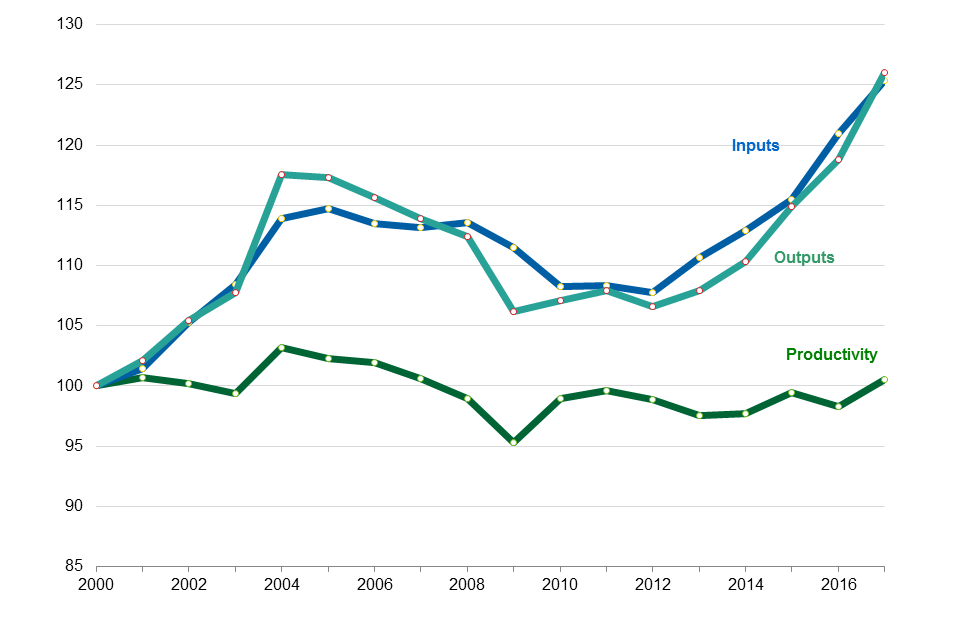 - In 2017 inputs grew by 0.8 per cent, while outputs grew by only 0.2 per cent, resulting in the productivity decrease.