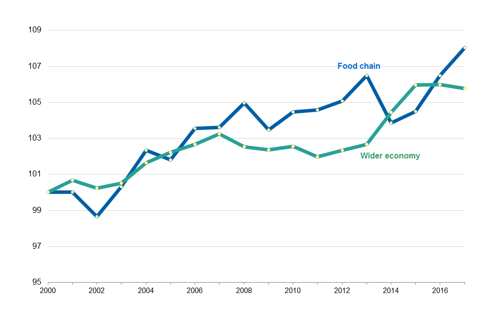 - In 2017 the productivity of the food chain increased by 0.8 per cent, while there was no change in the productivity of the wider economy. In the 10 years prior to 2017, the average annual growth rate of the food chain was 0.3 per cent whereas the wider economy’s average annual growth rate was 0.2 per cent.
