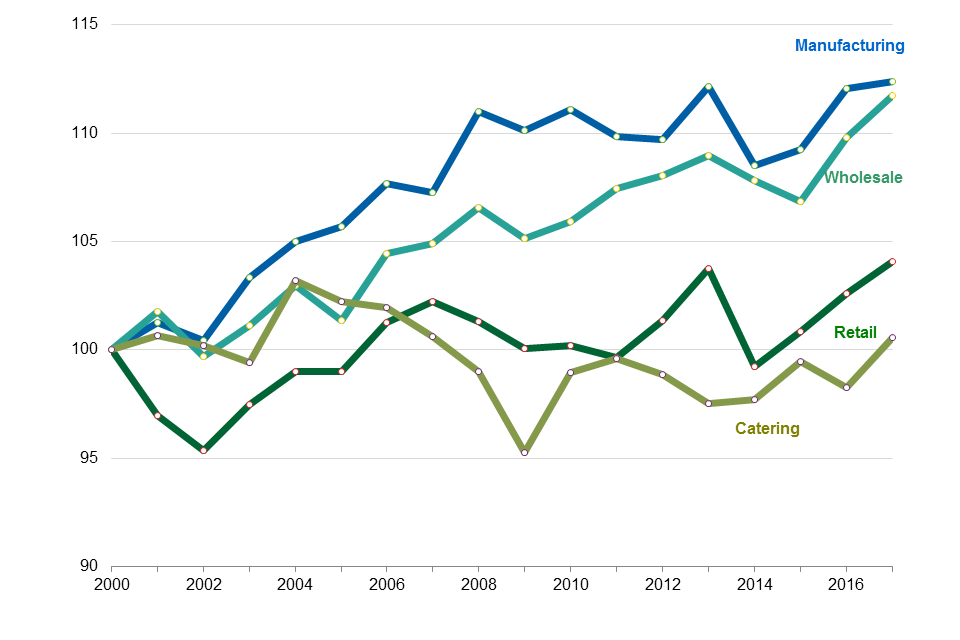 - In 2017 manufacturing wholesale and retail sectors have a higher productivity than in 2000, but the last time catering had a higher productivity level than in 2000 was in 2007. However, manufacturing and wholesale have increased much more than retail since 2000.