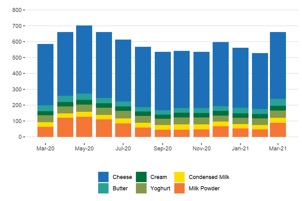 Usage of milk by dairies in the United Kingdom statistics: March 2021 (published 7 May 2021)
