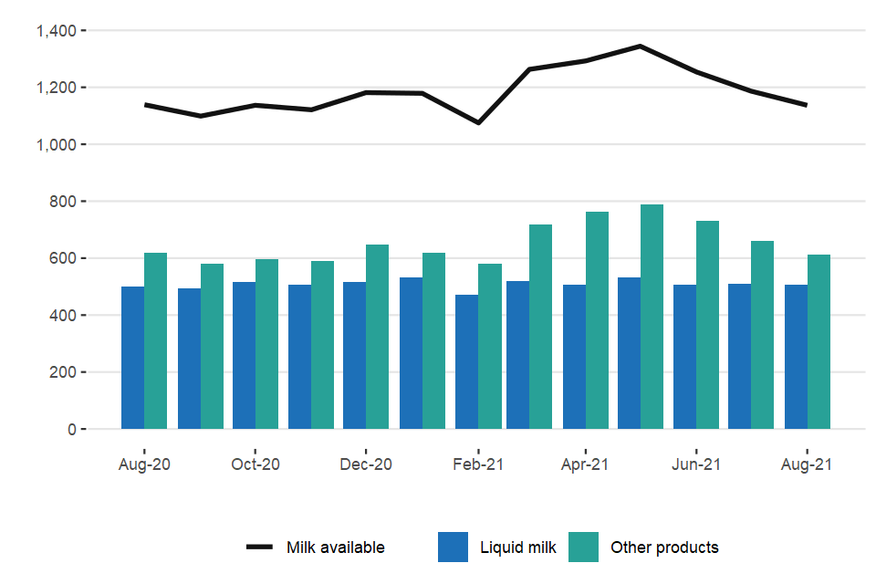 Usage of milk by dairies in the United Kingdom statistics: August 2021 (published 30 September 2021)