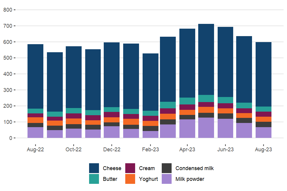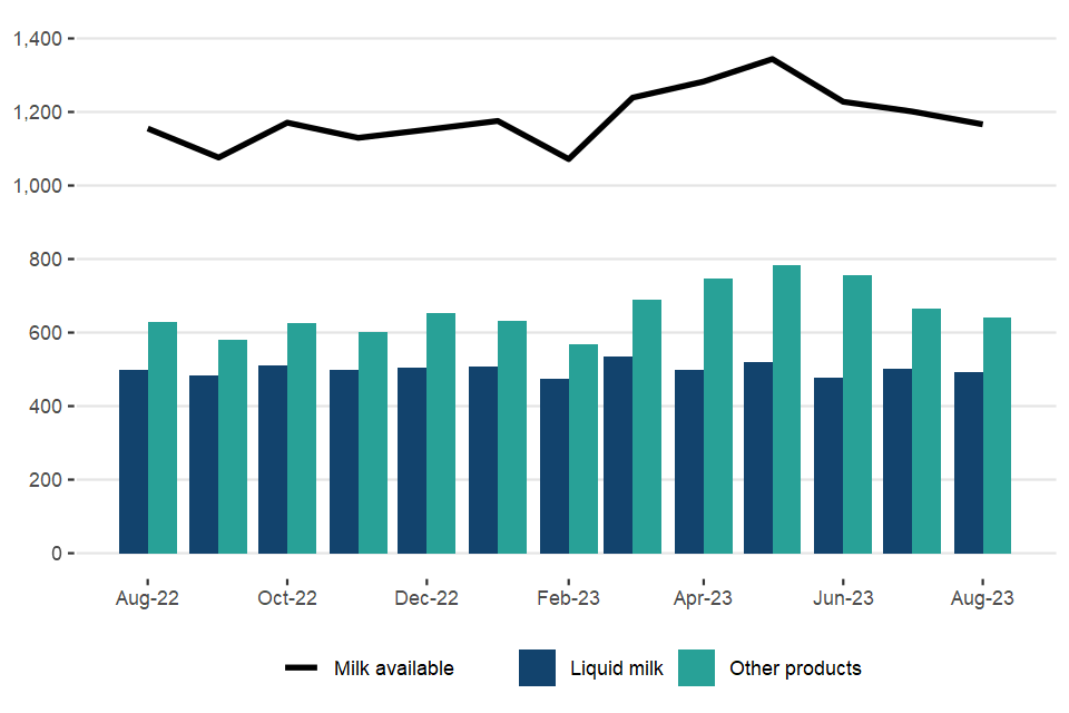 Usage of milk by dairies in the United Kingdom statistics: August 2023 (published 05 October 2023)