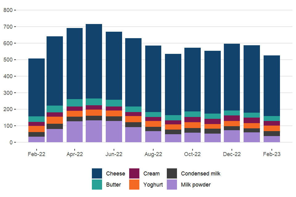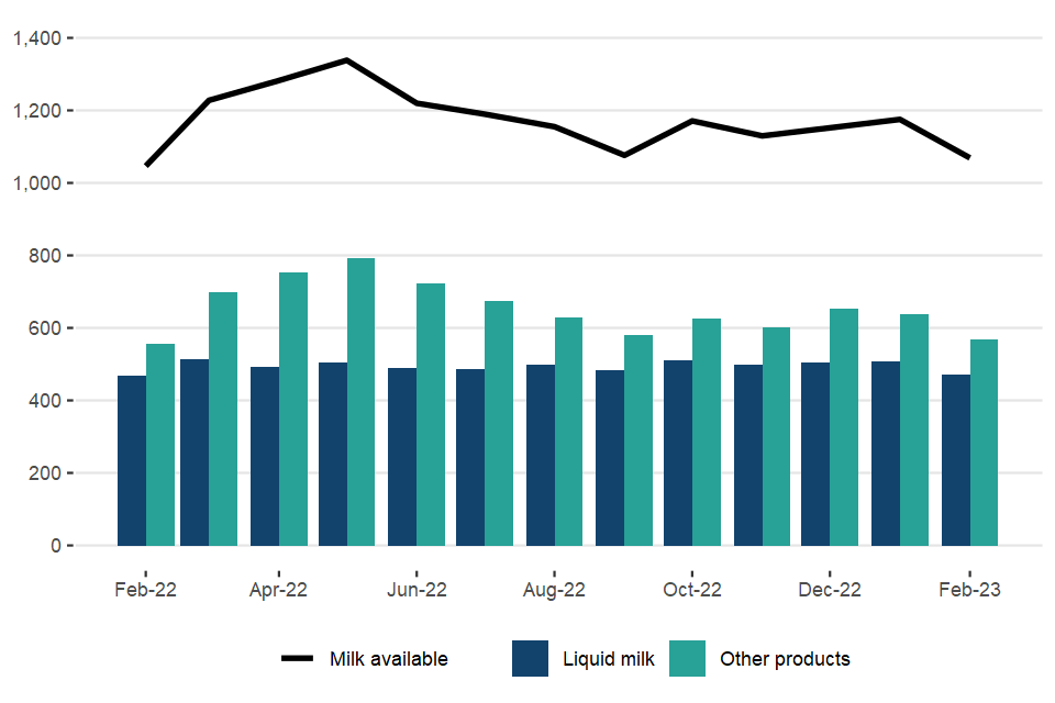 Usage of milk by dairies in the United Kingdom statistics: February 2023 (published 30 March 2023)